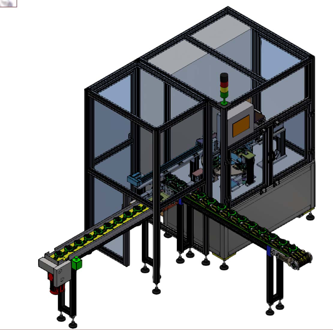 1 待检测产品从传输线自动上料至上下料工位OP10。2 传感器检测到产品,夹爪自动抓取。3 扫描产品DMC,获得产品序列号。(可选)4 产品旋转至OP20, NewVista螺纹检测仪自动检测M2螺纹;5 产品旋转至OP30, NewVista螺纹检测仪自动检测M3螺纹4只(通过伺服平台);6 产品旋转至OP40,对螺纹吹气清洁;7 产品旋转至OP10,自动下料至下料皮带线(NG件自动进入NG料盒);检测完成后,OK产品标记机构对产品进行标记。将检测结果绑定产品序列号,并上传至PC数据库。(可选)